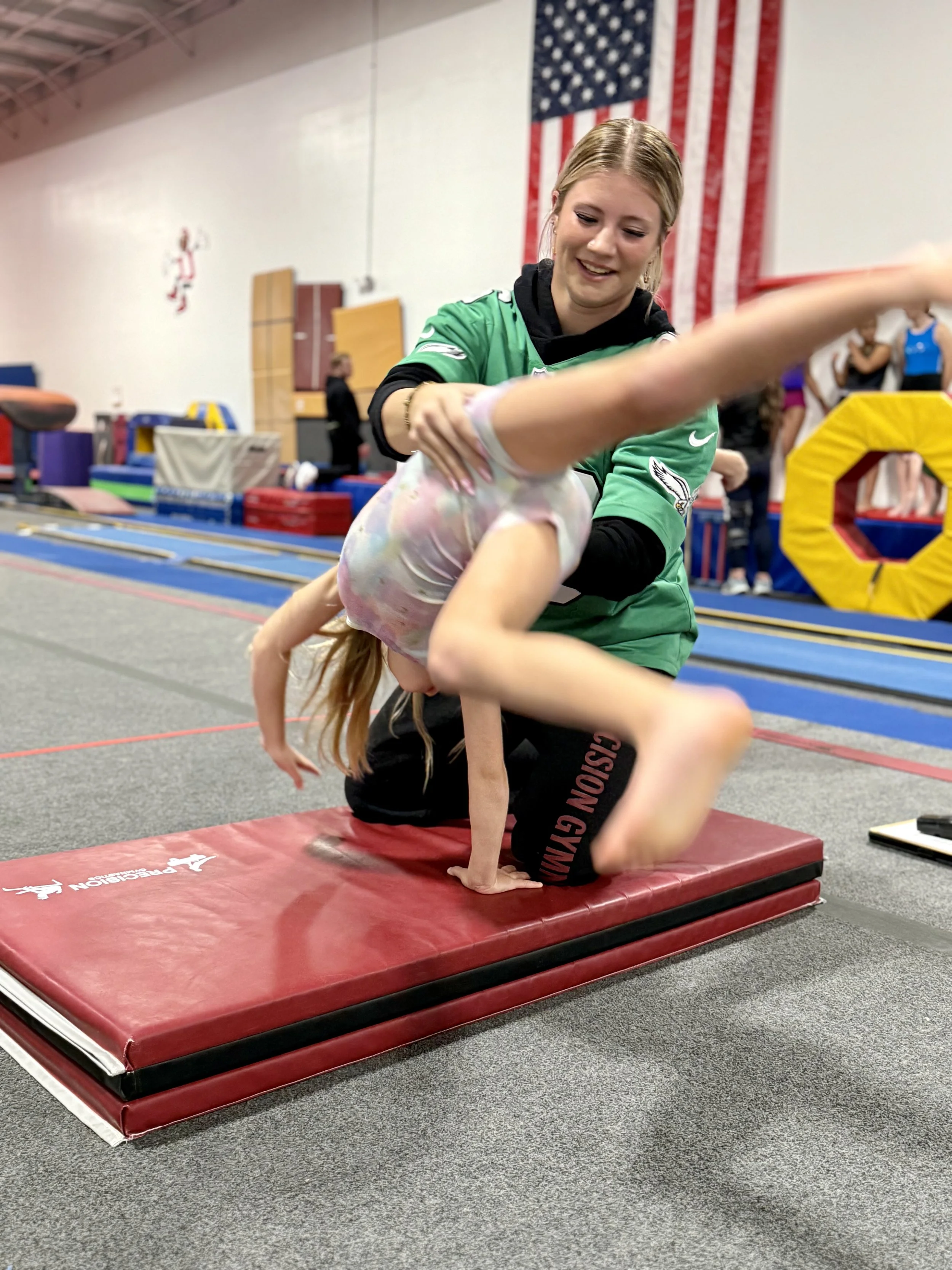 Our mission at Precision Gymnastics is to coach each athlete to reach their highest achievable goal in a positive, fun, challenging and safe environment. We strive to provide the tools to inspire the gymnasts to reach their maximum potential; while we work to build strong competitors with developing personalities of strength and resiliency.